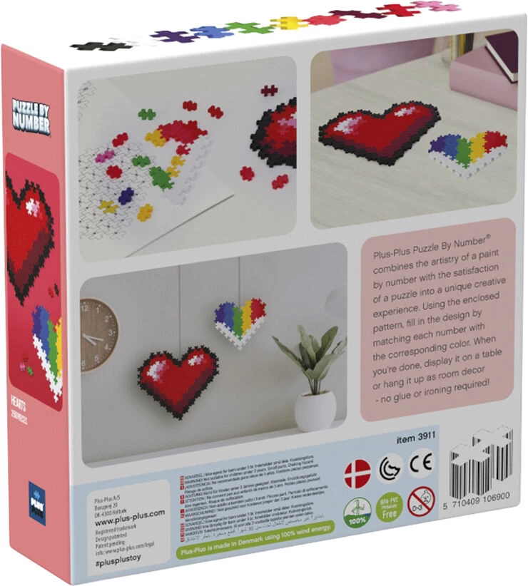 Byg to flotte hjertemosaikker med Puzzle by Number ved at matche farver med tal Puzzle by Number kombinerer leg og læring og gør det nemt at bygge flotte mosaikker. du kan hænge op på dit værelse Eller byg noget helt andet – kun fantasien sætter grænser Kræver hverken lim eller stygning Sættet indeholder 250 stk Plus-Plus