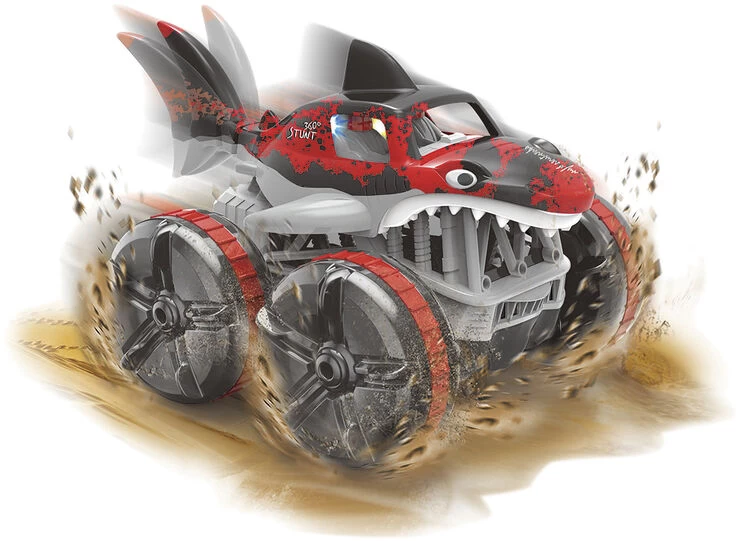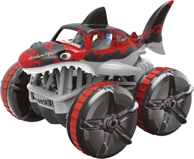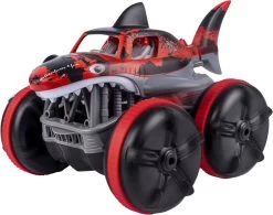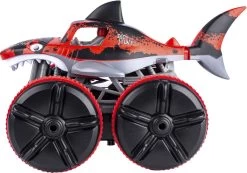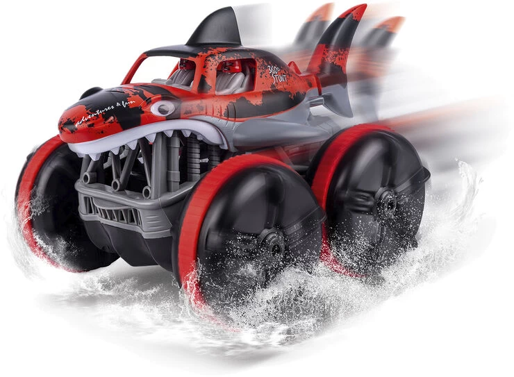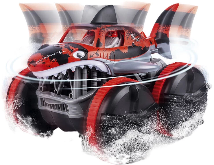 Radiostyret Water Shark Sej hajtruck der kan køre på land og i vand! Med bevægelig hale og 360 gr spin 7.4V 500 MAH Li-ion genopladeligt batteri medfølger bilen. og der skal bruges 2 stk AA-batterier til fjernbetjeningen (ikke inkl)