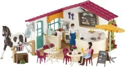 Mums! Når duften af friskbagt æbletærte breder sig i ryttercaf en fra Schleich HORSE CLUB, løber kundernes tænder i vand Blandt hestefans er det farverige mødested også kendt som Cups and Saddles , som på dansk betyder Kopper og Sadler Hvor sejt, at du kan få lækker tærte og varme drikke her sammen med dine venner. og takket være truget og vandhullet behøver din hest ikke at føle sig udenfor Men pas på, at din hest ikke begynder at bide i borddekorationerne! For hvilken hest ville ikke elske at nippe til friske blomster?