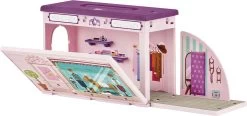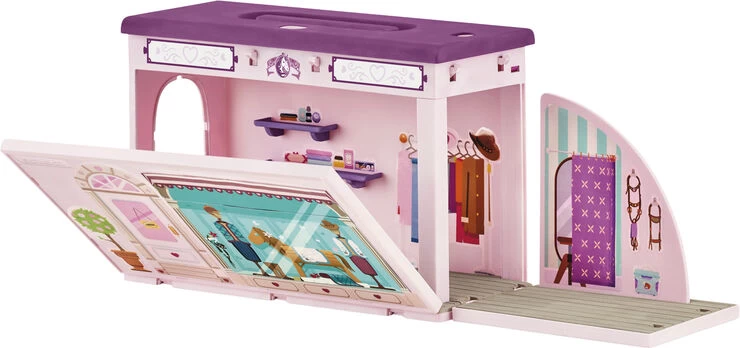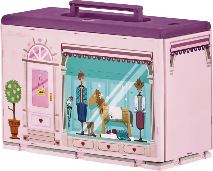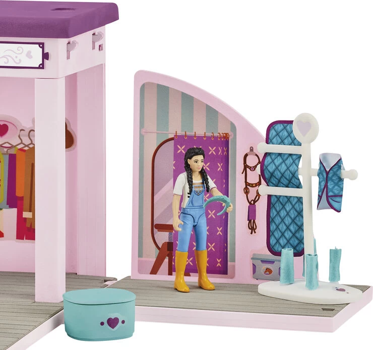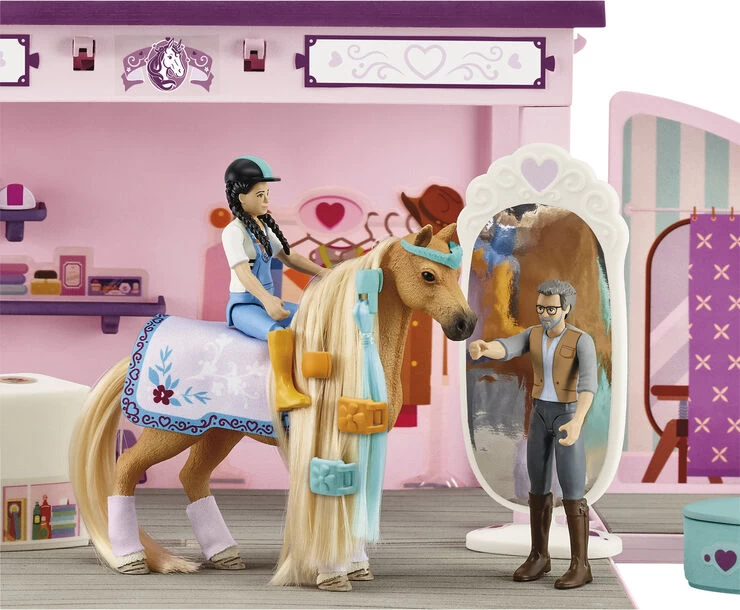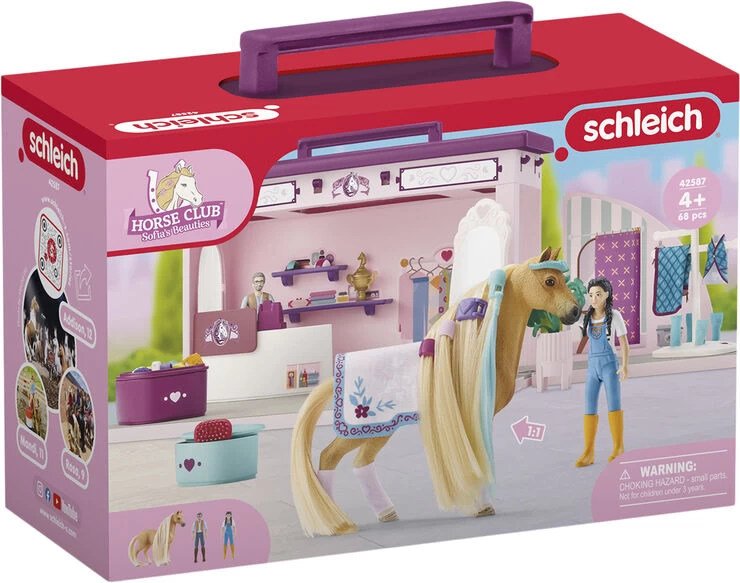 Pop-op-butikken fra Schleich HORSE CLUB Sofias Beauties har flotte dækkener og tilbehør i mange forskellige farver, så der er noget for enhver hest Har du lagt mærke til. at du ikke kun kan flette og style manken og halen, men også udskifte dem? Så Sofia og hendes hoppe behøver ikke at nøjes med n frisure Perfekt til enhver fotosession Også når det foregår på legepladsen bag huset Du kan nemlig hurtigt pakke hele butikken sammen og tage den med Så, nu skal alle stå helt stille og smile til fotografen
