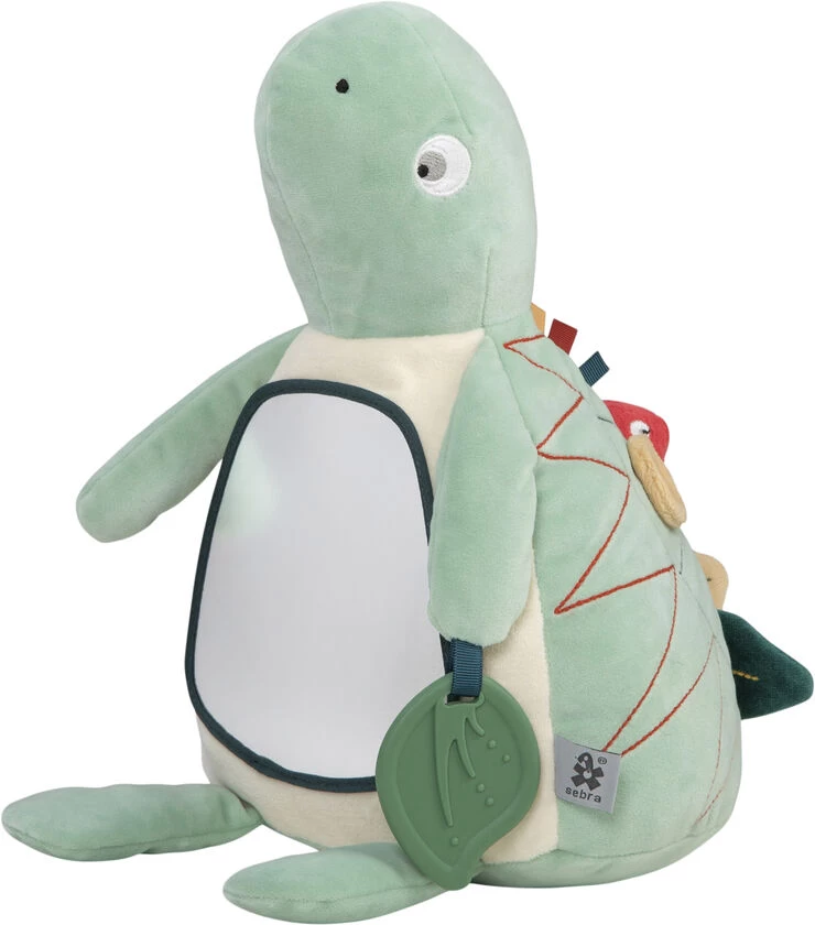 Skildpaddebamsen har et stort babysikkert spejl på maven, og holder en teether, der er perfekt til ømme gummer, i hånden. Babypejlet på skildpaddebamsens mave stimulerer dit barns nysgerrighed, og giver det mulighed for at udforske sine egne ansigtsudtryk og bevægelser. Små fingre kan også gå på opdagelse i knitre-blade og nulre-tags, der er fordelt på den 31 cm høje skildpaddebamse. Anbefalet alder: 0+