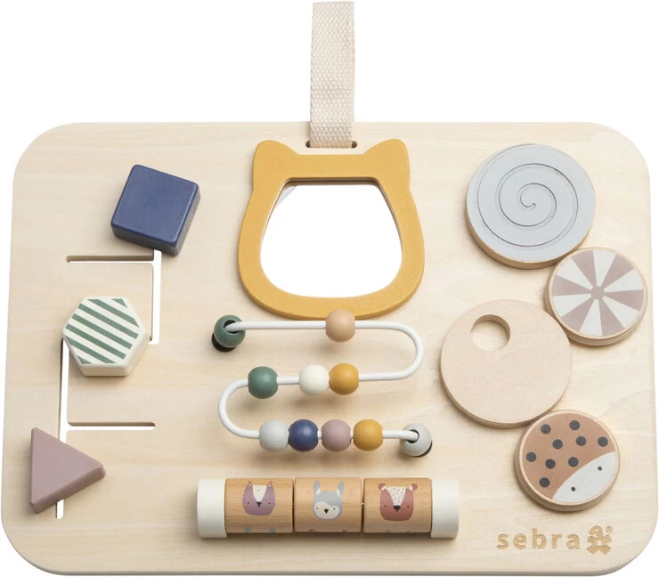 Flot aktivitetstavle i træ til at hænge på væggen, tage med i klapvognen eller bruge som nakketræning på gulvet. Tavlen er fyldt med aktiviteter, der styrker barnets finmotoriske færdigheder og stimulerer nysgerrigheden. Før de farverige perler gennem den snoede wire, tæl dem og sig deres farver. Skub de små træklodser i forskellige farver og former rundt, og rul med ringene, så figurerne matcher. Perfekt dåbsgave, der kan holde til mange søskende og generationer. Anbefalet alder: 4 måneder+