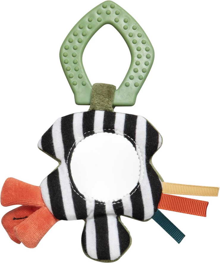 Fin aktivitetsrangle til de helt små med kontrast-striber i sort/hvid samt babyspejl. Denne rangle, formet som et blad, er et aktivitetslegetøj særdeles egnet som barnets første rangle. Ranglens størrelse passer godt i babyens hånd. Ranglen er udformet som et blad – grønt på den ene side og med sorte og hvide striber samt et babyspejl på den anden side. Kontrasterne er stimulerende og er med til at udvikle hjernen og synssansen. Nuller-tags og en bidering med knopper sidder fast på bladet. Aktivitetsranglen hjælper med til at styrke og udfordre: Følesansen – når barnet mærker teksturer, blødhed og hårdhed samt forskellige materialer. Synssansen – når barnet oplever, kontraster, farver og teksturer. Smagssansen – når barnet bider i eller sutter på produktet og mærker at elementerne smager / føles forskellige. Grov og fin motorik – når barnet griber fat om produktet og senere hen udforsker de forskellige nuller-tags. Høresansen – når barnet lytter til ranglens lyd. Anbefalet alder: 0+. Mærkning: CE, UKCA. Advarsel. Må ikke anvendes i nærheden af åben ild. OBS! Kvælningsfare: Fjern beskyttelsesfilmen fra spejlet inden du giver legetøjet til barnet.