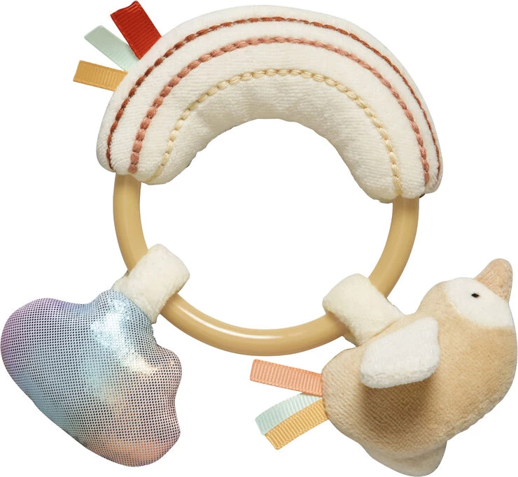 Flot og sjov aktivitetsring med en regnbue, fugl og sky. På aktivitetsringen sidder der i toppen en smuk regnbue med nuller-tags, og i bunden af ringen hænger fuglen Bliss foran en skinnende sky. Aktivitetsringen hjælper med til at styrke og udfordre: Følesansen – når barnet mærker teksturer, blødhed og hårdhed samt forskellige materialer. Synssansen – når barnet oplever, kontraster, farver og teksturer. Grov og fin motorik – når barnet griber fat om produktet og senere hen udforsker de forskellige nuller-tags. Høresansen – når barnet lytter til aktivitetsringens lyd. Anbefalet alder: 0+. Mærkning: CE, UKCA. Advarsel. Må ikke anvendes i nærheden af åben ild.