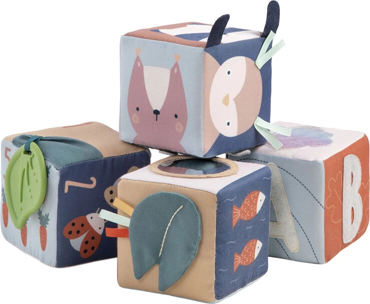 Bløde stofklodser med babyspejl, bidering og illustrationer fra Sebras tema Woodland. Disse fire underholdende aktivitetsklodser er skabt til den første leg, til at begejstre babyer og stimulere deres nysgerrighed. Perfekte til legetid på maven og som tidligt legetøj, som barnet kan gribe ud efter og øve hånd-øje koordination med. Klodserne er bløde at røre ved på grund af det indvendige skum, og har interessante teksturer og funktioner, som barnet kan udforske. Sæt klodserne oven på hinanden og brug dem som stabelklodser, vælt dem og start forfra. I kan også få en snak om dyrene, der er illustreret på klodserne. Barnet møder her uglen Blinky, ræven Sparky, vaskebjørnen Rebel, bjørnen Milo, egernet Zappy og haren Siggy. På klodserne er bogstaverne A, B, C og D også at finde, ligesom der også findes 5 tælle-sider med tallene fra 1-5. På tælle-siderne kan barnet se illustrationer, der passer med tallet – eksempelvis tallet 3 og tre regnbuer, tallet 4 og fire agern. På siden med tallet 1 er en bidering formet som et blad. Bideringen er lavet af plastmateriale, der naturligvis er fri for BPA, ftalat og formamid. Bideringen er perfekt, når de første tænder melder deres ankomst og gummerne klør. På en af de bløde klodser kan barnet blandt andet spejle sig selv i et sikkert babyspejl. Her kan barnet lære sig selv at kende og udforske ansigtet og mimiker. Sjove teksturer og flapper er placeret forskellige steder på legeklodserne til glæde for barnets følesans. Høresansen bliver også stimuleret ved lydene fra bl.a. knitrepapir, en lille gemt klokke og en fløjtemekanisme. Anbefalet alder: 0+. Mærkning: CE, UKCA. Vaskeanvisning: håndvask. Advarsel. Må ikke anvendes i nærheden af åben ild. OBS! Kvælningsfare: Fjern beskyttelsesfilmen fra spejlet inden du giver legetøjet til barnet.