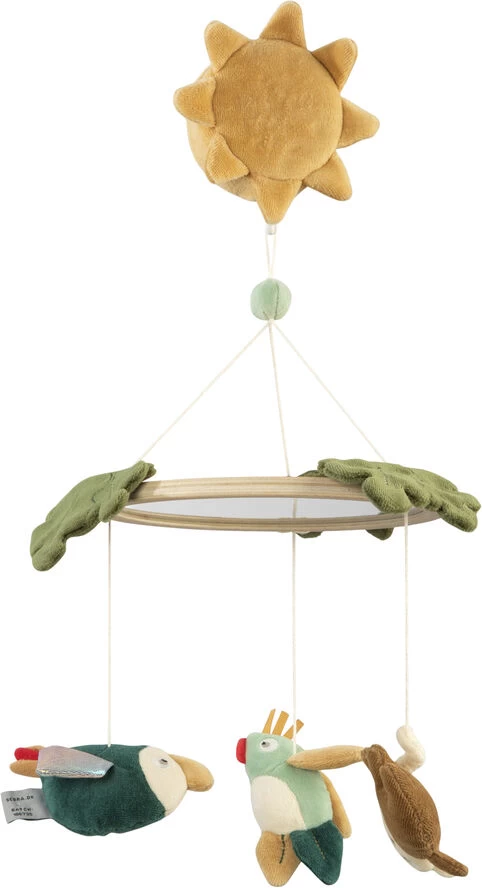 Musikuro med spejl, hvor baby kan udforske sit spejlbillede mens uroen spiller en lille melodi. De tre tøjdyr fra Wildlife-temaet drejer stille rundt og stimulerer babys sanser med forskellige former og farver. Trædelen, hvor spejlet sidder, er fremstillet af resttræ fra andre Sebra-uroer. På den måde belaster musikuroen miljøet mindre og vi optimerer udnyttelsen af ressourcerne. Musikuroen er mekanisk og behøver derfor ikke batterier. Den kan slukkes, hvis baby har brug for ro. En musikuro til baby kan være med til at skabe en genkendelig og tryg aktivitet ved puttetid. Et putteritual, så barnet er trygt i sin søvn og på en god og rolig måde forstår, at dagen er slut, når tonerne fra musikuroen slutter. Anbefalet alder: 0+.