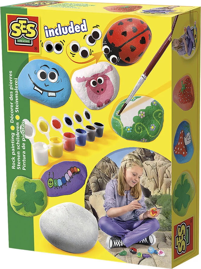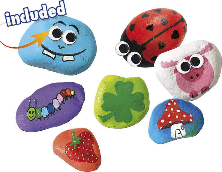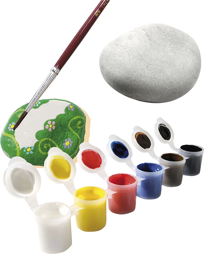 Dette kreativesæt indeholder allematerialer til at male en sten og dekorere den. Lav forskelligevarianter med de 6 grundfarver og påfør de sjove øjne, og giv stenen en identitet. Indhold: 5 sten, 6 farver,1 pensel, sjove øjne. Produceret i Holland. Alder: 5+