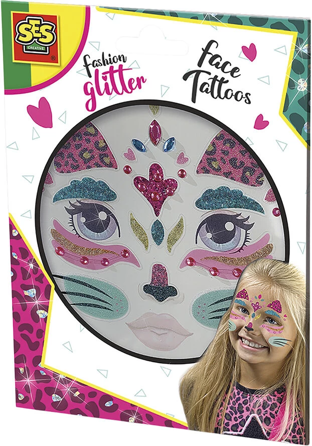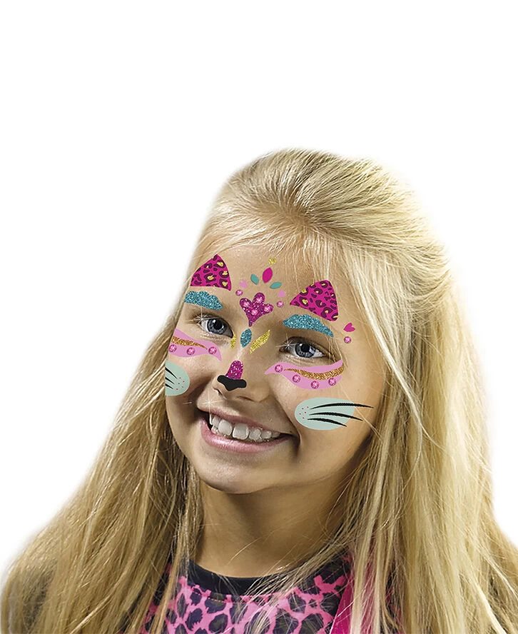 Glitrende ansigtsjuveler er på mode! Tatoveringsklistermærkerne og diamanterne er nemme at påføre huden, og tryller dig om til en glad kat. Emballage: 15 x 20 x 0,5 cm. Alder: 3+