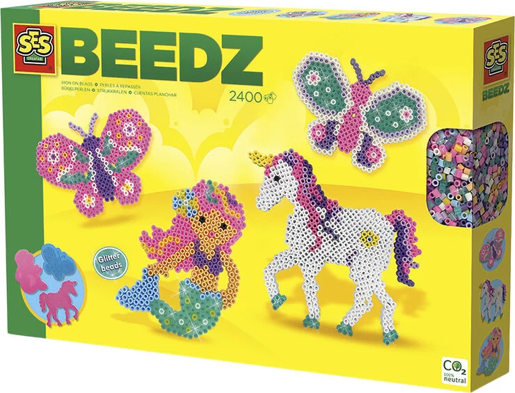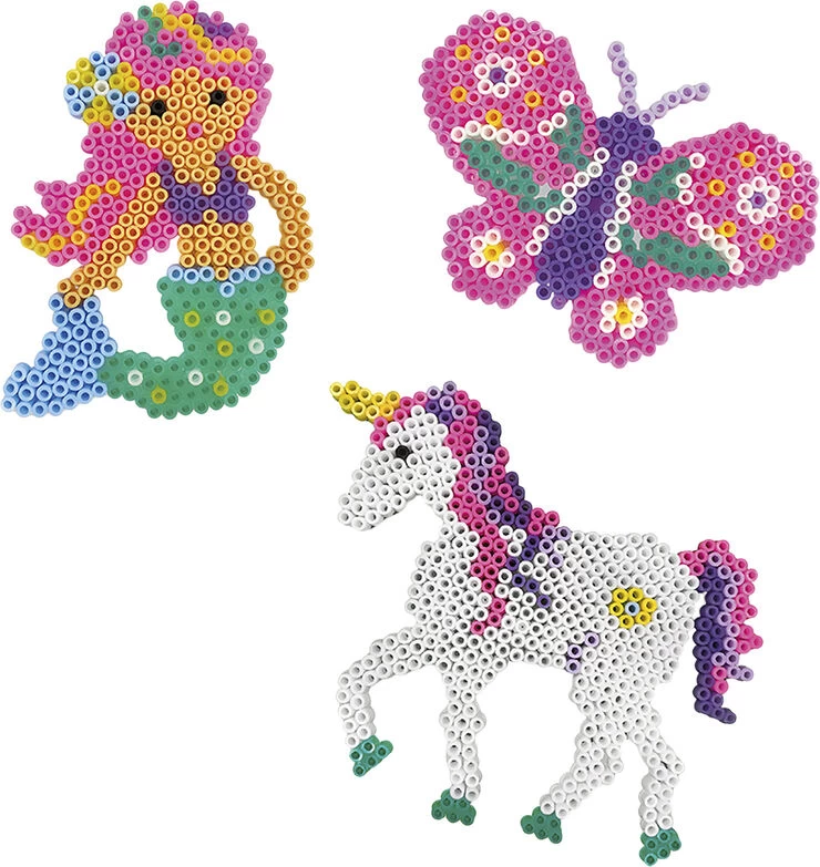Skab din egen fantasiverden med strygeperler! Med de medfølgende strygeperler og perleplader kan du lave de fineste enhjørninger, sommerfugle og havfruer. Ud over strygeperlerne i klare farver indeholder dette sæt også glitterstrygeperler. Indeholder: 2400 strygeperler, perleplade