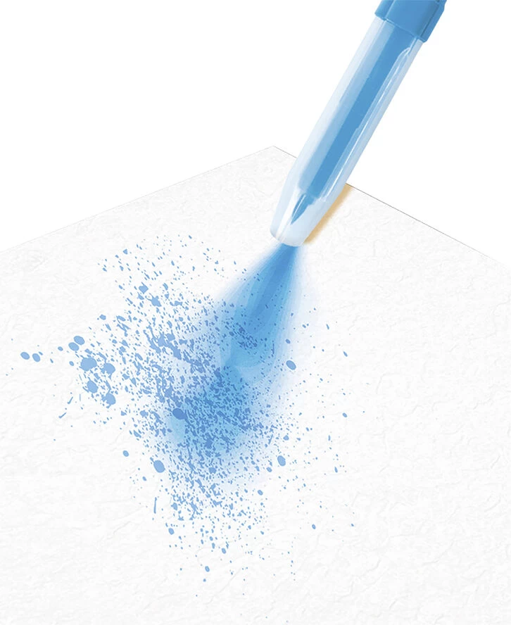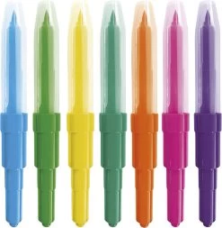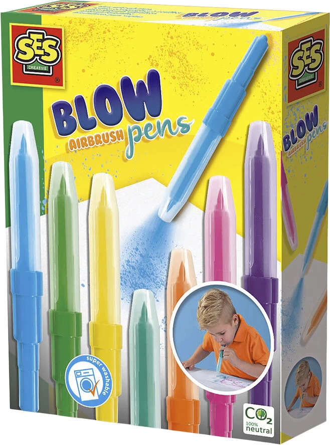 Wow! Disse airbrush-penne er unikke! Du kan lave dem om til markører, som du blæser ind i. Når du blæser, kommer en klar farve på din side. Brug de syv farver til at omdanne dine farvelagte tegninger. Gul, Orange, Grøn,Blå,Lilla, Pink ogTurkis airbrush-pen med blæsefunktion. Nemt at vaske af huden. Produkt:15 x 20 x 4 cm Produceret i Holland Alder: 5+