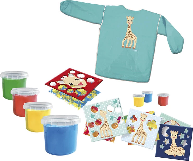 Lav sjove kunsthåndværk med Sophie la girafe! Med fingermalingen fra SES kan selv de mindste lave de skønneste kunstværker. Dub fingermalingen på hvide papirark, og skab de skønneste kunstværker. Læg et fint kort med Sophie la girafe oven på, mens malingen stadig er våd. Masser af sjov for de mindste, og resultatet er altid flot. Indhold: 4 x fingermaling, 1 Sofie la girafe forklæde, 8 Sofie la girafe overlægningskort, 8 papirark. Emballage: 30 x 20 x 60 cm. Produceret i Holland. Alder: 1+
