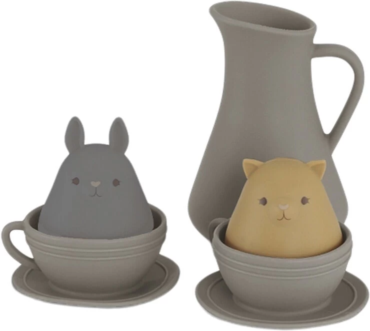 “Bath toys – little bunny and cat in two tea cups and a tea pot Choose between three colors Made of 100% LFGB silicone CE-tested after European standard EN-71-1 Suitable from +0 years old Cleaning instructions- Wash in warm soapy water Do not use any chemicals WARNINGS- Please keep the packaging for future reference Style no.- KS2618”
