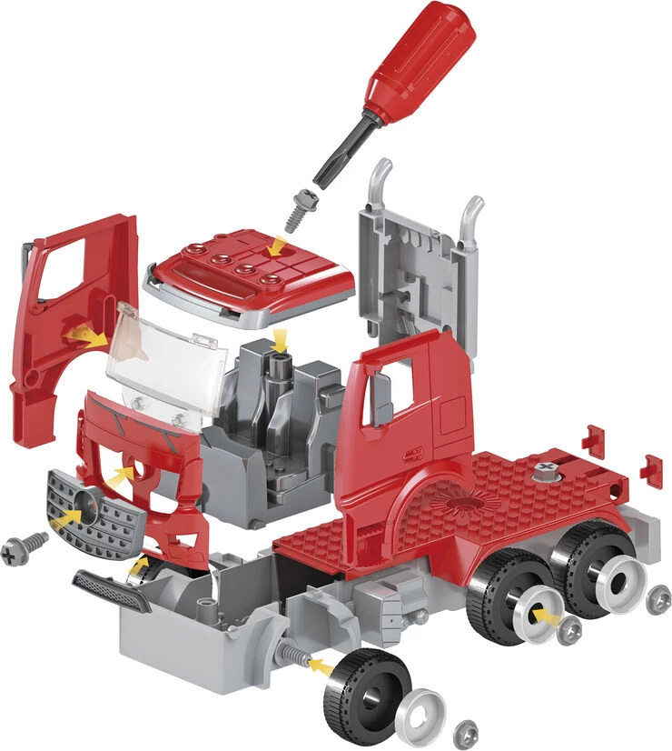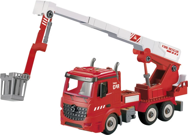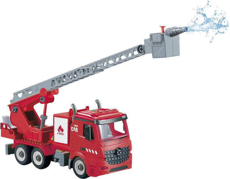 2-i-1 brandbilsæt med lys, lyd, take-apartfunktion og hjelm Skift mellem 2 brandbiler Inkl hjelm, værktøjssæt med skruetrækker der kan bruges til at adskille og samle køretøjet, bevægelige dele og friktion Inkl 3 stk knapcellebatterier