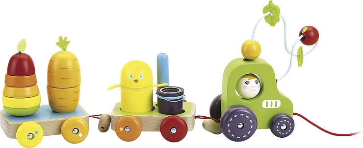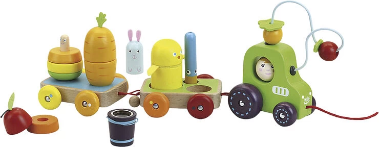 En pære med en orm inden i. En lille kanin, som er gemt inden i en gulerod, en fugl og en and, som larmer, en spand med majs og en traktor, hvor der læsses frugt. Et helt fantasiunivers til at udvikle motorikken. Produkt: 40 x 15 x 9,5 cm Emballage: 34 x 16 x 10 cm Alder: 18-36 mdr
