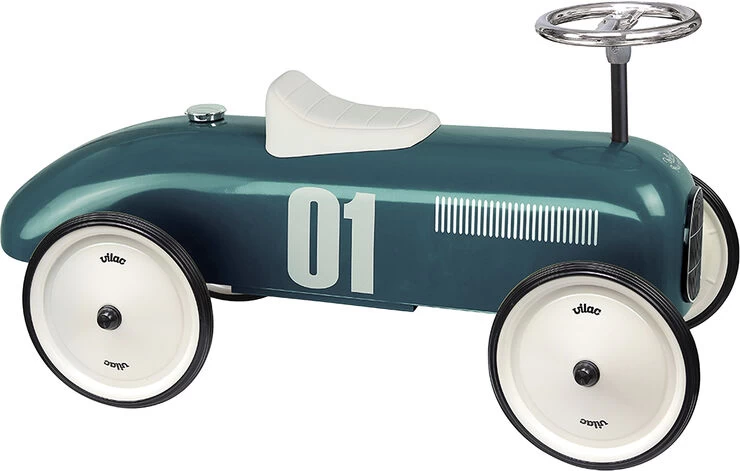 Petroleumsblå racerbil i metal til de små. Bilen har et gennemført, klassisk design med rigtige gummihjul, kølergitter, benzindæksel samt behageligt sæde i læderlook og sidst men ikke mindst, indfarvede fælge. Bilen leveres usamlet. Produkt: 38 x 77 x 40 cm. Emballage: 23 x 80 x 18 cm. Alder: 18mdr+
