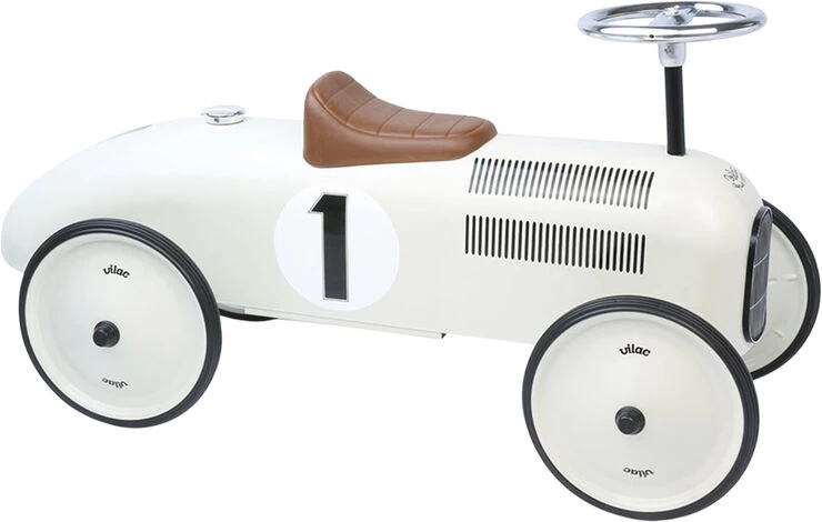 Råhvid racerbil i metal til de små. Bilen har et gennemført, klassisk design med rigtige gummihjul, kølergitter, benzindæksel samt behageligt sæde i læderlook og sidst men ikke mindst, indfarvede fælge. Produkt: 38 x 77 x 40 cm Emballage: 23 x 80 x 18 cm. Alder: 1+