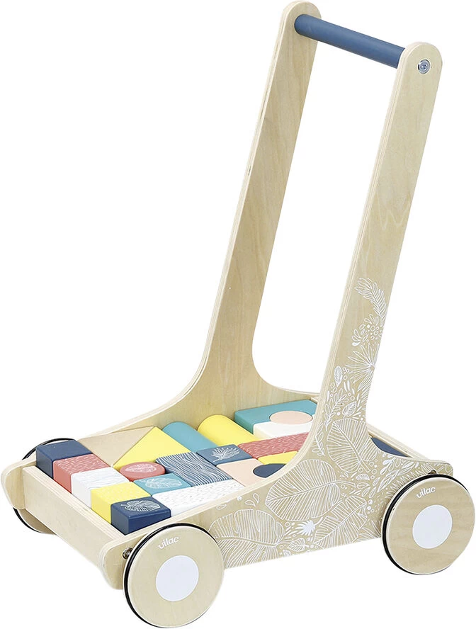 Smuk gåvogn inkl. 24 byggeklodser i mange former og farver. I bunden af vognen er der fint illustreret, hvor klodserne skal placeres. Gåvognen kan ikke holde til barnets vægt. Produkt: 46 x 37,5 x 30 cm. Emballage: 47 x 38,5 x 3,5 cm. Alder: 1+