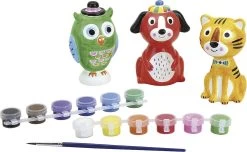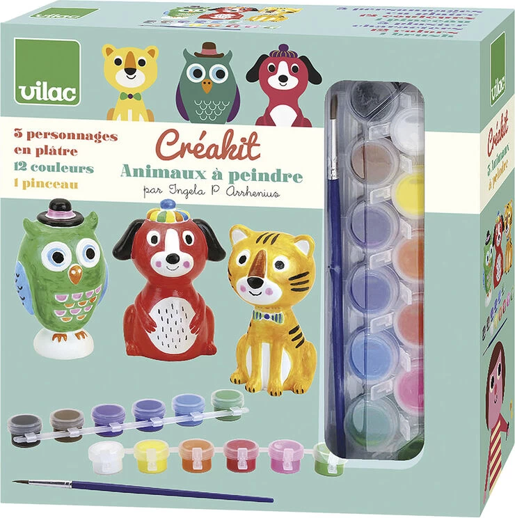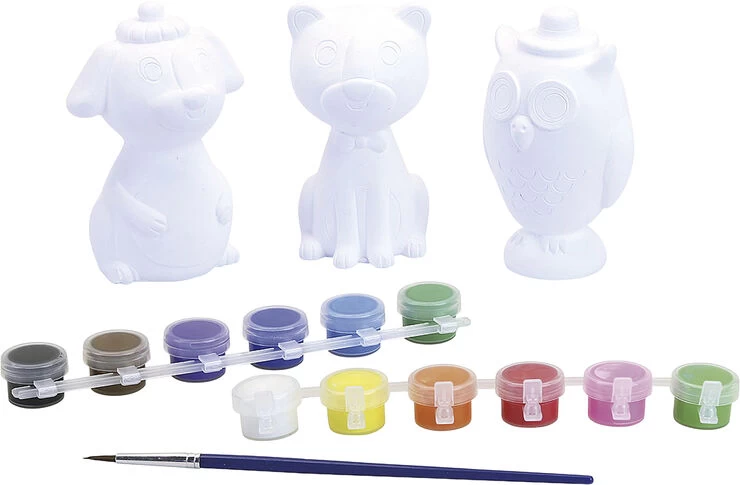 Designet af Ingela Arrhenius. 3 små gipsfigurer af en ugle, hund og kat, som skal males. Maling i 12 forskellige farver og pensel medfølger. En god gaveidé eller pynteting. Emballage: 21,5 x 21,5 x 7 cm. Alder: 4+