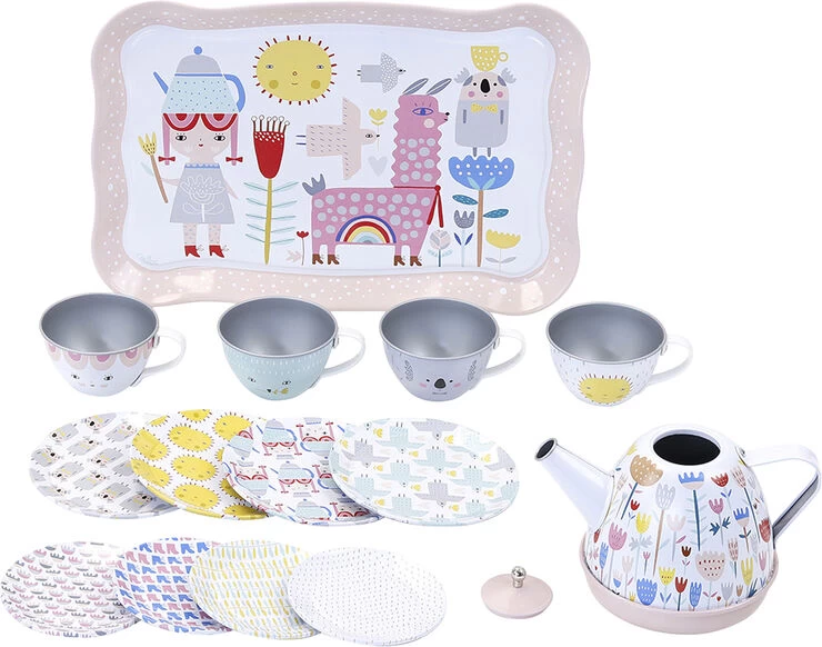 Kufferten indeholder 14 dele til 4 personer. Musikalsk tepotte med fødselsdagssang, 4 kopper og underkopper, 4 kagetallerkner, 1 bakke. Leveres i en fin papæske. Illustreret af Suzy Ultman. Emballage: 26 x 18 x 9,5 cm. Alder: 3+
