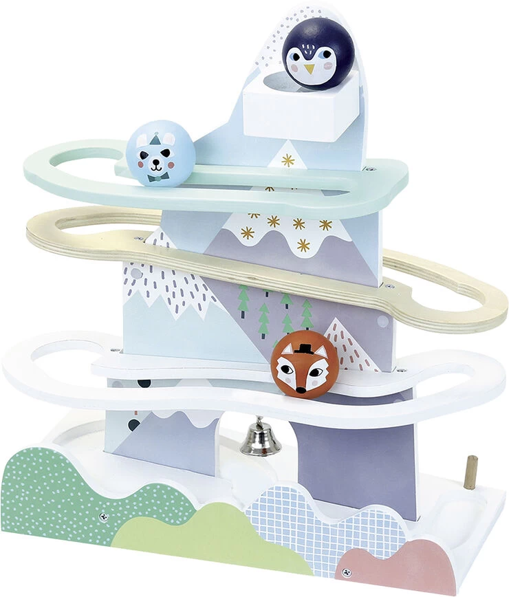 Bane i træ med vandfald og bolde, der kører ned. Boldene i form af en ræv, en pingvin og en kanin. Illustreret af Michelle Carslund. Produkt: 35 x 38 x 15 cm Emballage: 36 x 39 x 16 cm Alder: 1-3 år