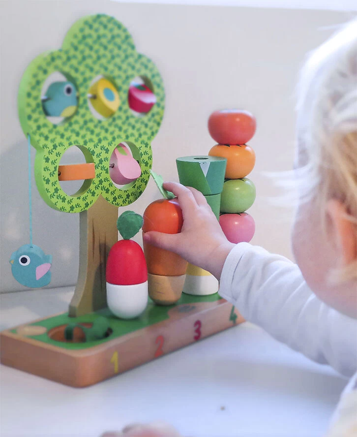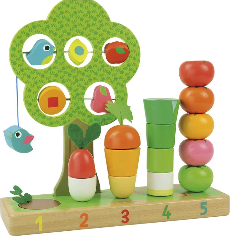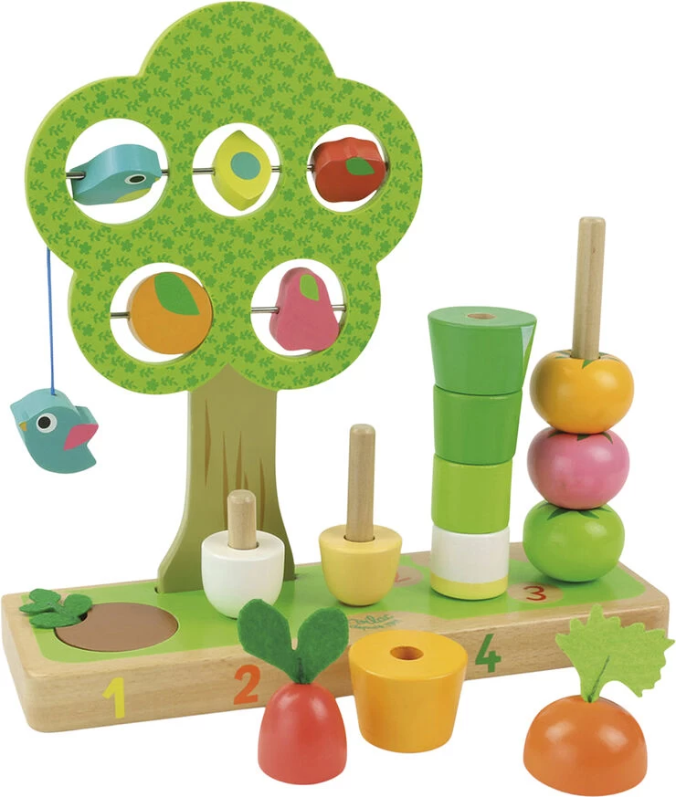 Lær de første tal at kende med denne aktivitetshave. Fugle og frugter drejer rundt i træet, en fugt svinger i en snor, en radise har gemt sig under jorden og grøntsagerne kan stables. En god måde for barnet at lære om former, farver, tal og grøntsager. Produkt: 24,5 x 26,5 x 9 cm Emballage: 27 x 28 x 9,5 cm Alder: 18-36 mdr