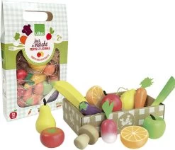 Frugt og grønt legemad med banan, æbler, pære, aubergine, appelsin, champignon, citron, gulerod, porre, tomat, radisse Alle dele er fremstillet i træ. Produkt mål: 5 x 23 x 20,5 cm Emballage mål: 33 x 21 x 5 cm Alder: 2-5 år