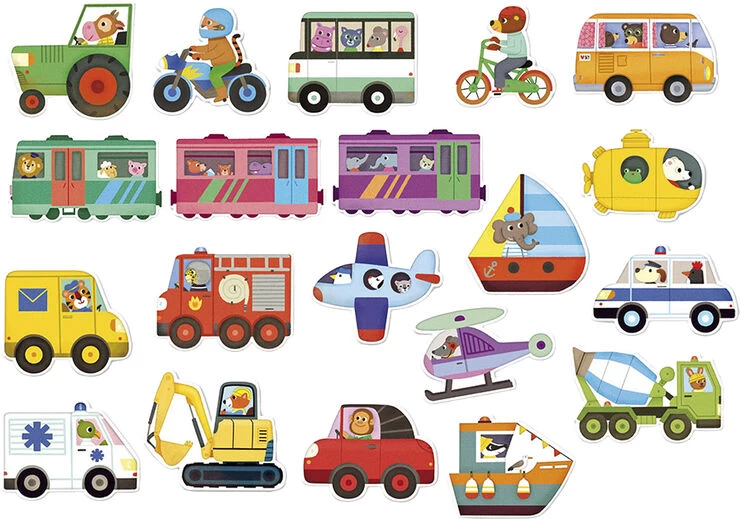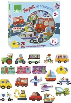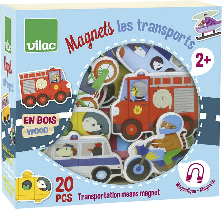 Farverige træmagneter. 20 stk med 20 forskellige transportmidler. Så er der altid god underholdning foran køleskabet, når den lille vil være i nærheden af mor eller far i køkkenet under madlavningen, eller på magnettavlen i stuen eller på værelset. Leveres i flot trææske med gennemsigtigt plastiklåg. Kan bruges både til leg og læring. Emballage mål: 14 x 15 x 6 cm Alder: 2-5 år