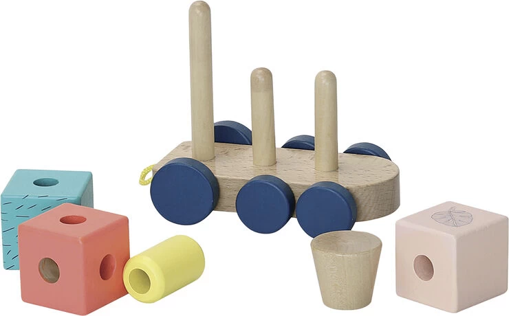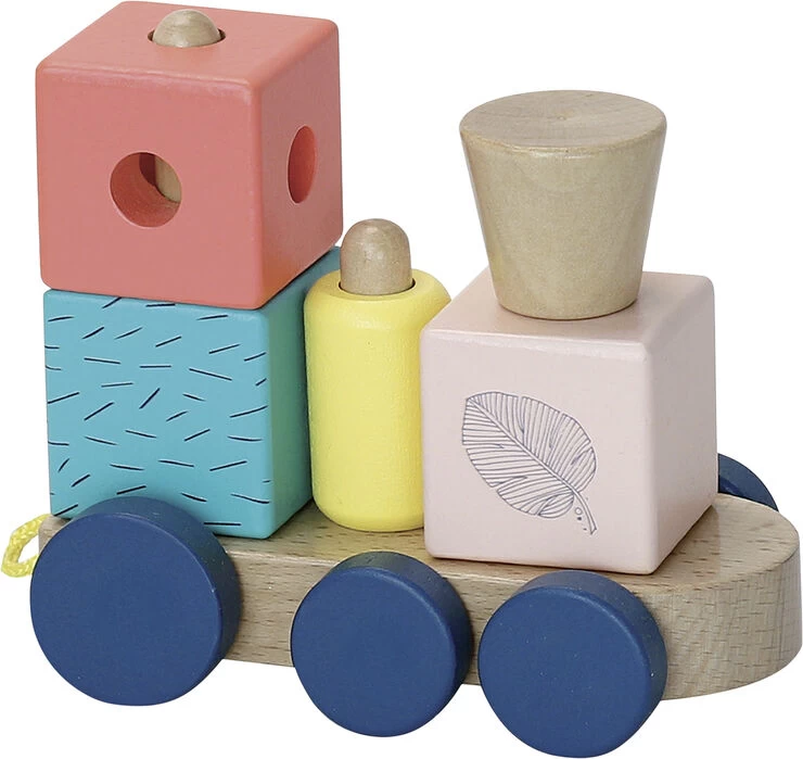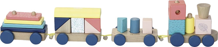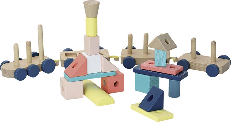 Togsæt med 4 togvogne, hvorpå man kan stable klodser og bygge bygninger. Alt i naturlige douce farver. Produkt: 56 x 11 x 7 cm. Emballage: 44 x 12 x 8 cm. Alder: 18mdr+
