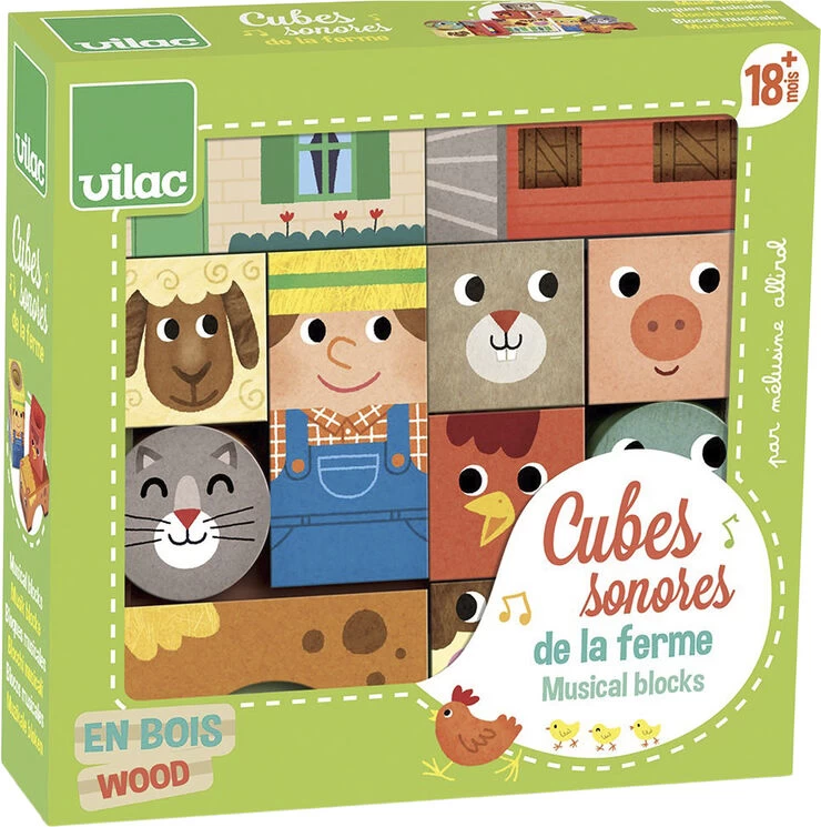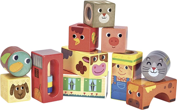 Træklodser med dekoreret bondegårdstema og lyd. Stabl dem til et tårn eller leg med klodserne enkeltvis. Sæt med 11 klodser. Emballage: 19,5 x 19,5 x 4,5 cm Alder: 18-36 mdr
